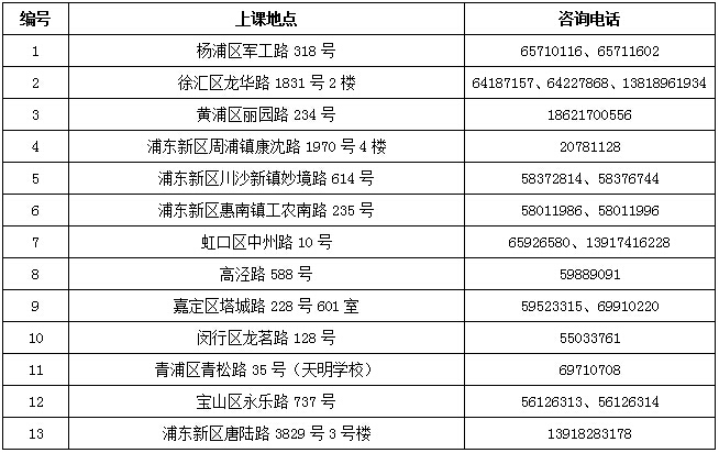 6、上课地点一览表: