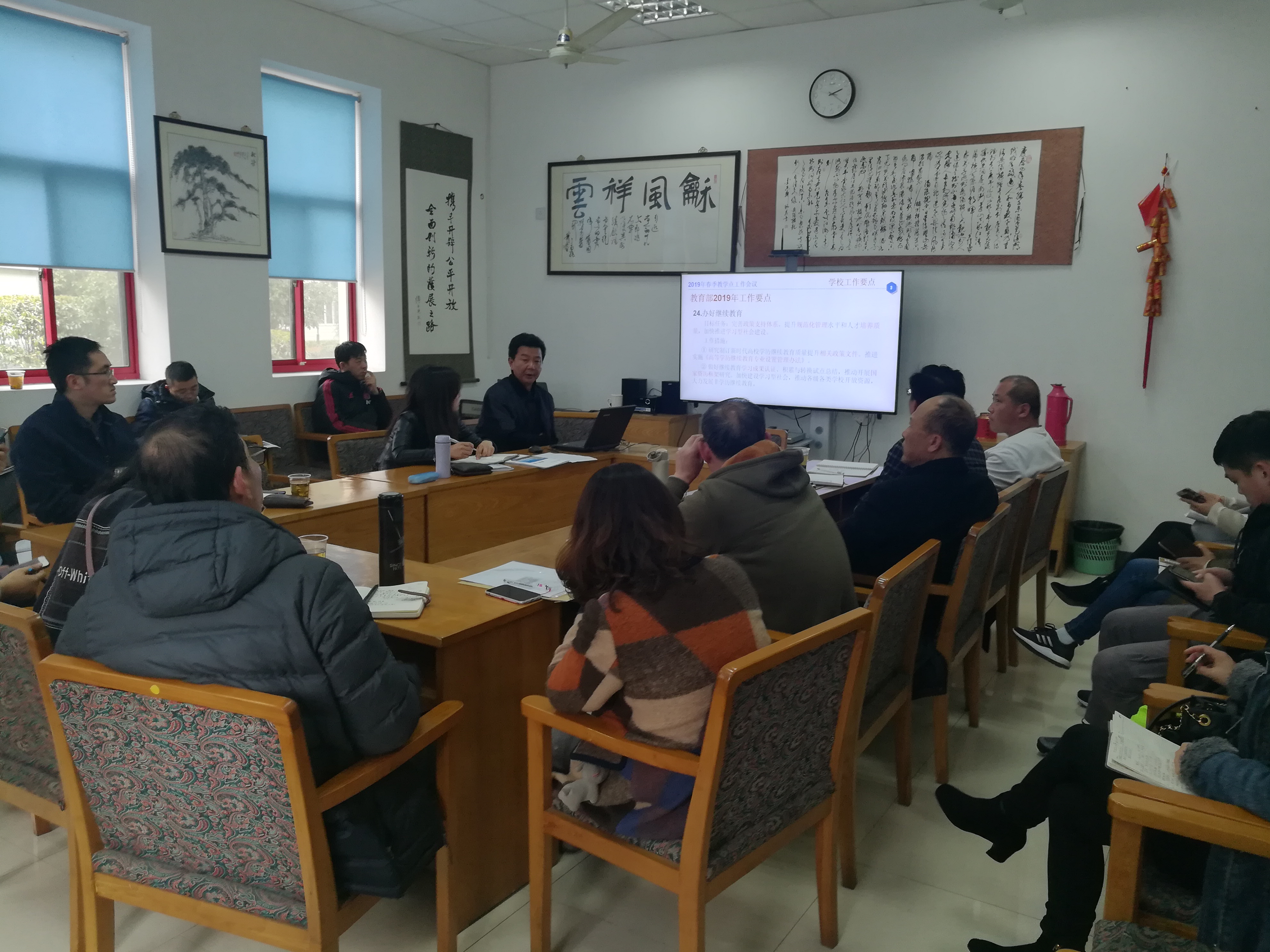首先,各教学点负责人对新学期开学情况进行汇报,各项教学运行秩序井然,开学总体情况良好。学历部郑飞老师对近期拟招生专业申报、试卷提交以及教学日历上传等相关工作进行布置,要求各教学点一定要按照时间节点保质保量完成各项工作。殷曦敏院长从《学生手册》的修订、《2018版教学一览》编制等十个方面对去年的工作进行了回顾总结,又介绍了上海市教委、beat365唯一官方网站等不同层面有关学历教育的工作重点,指出本学年学院将从《教学管理手册》制订、教学教务平台升级和学习站点评估等方面重点推进。学院教学督导组张慕容老师代表督导组对各教学点去年对教学督导工作的支持表示感谢,同时强调,本学年将在日常工作检查的同时重点对考试试卷和毕业论文展开专项督导,希望各教学点做好相关工作准备。