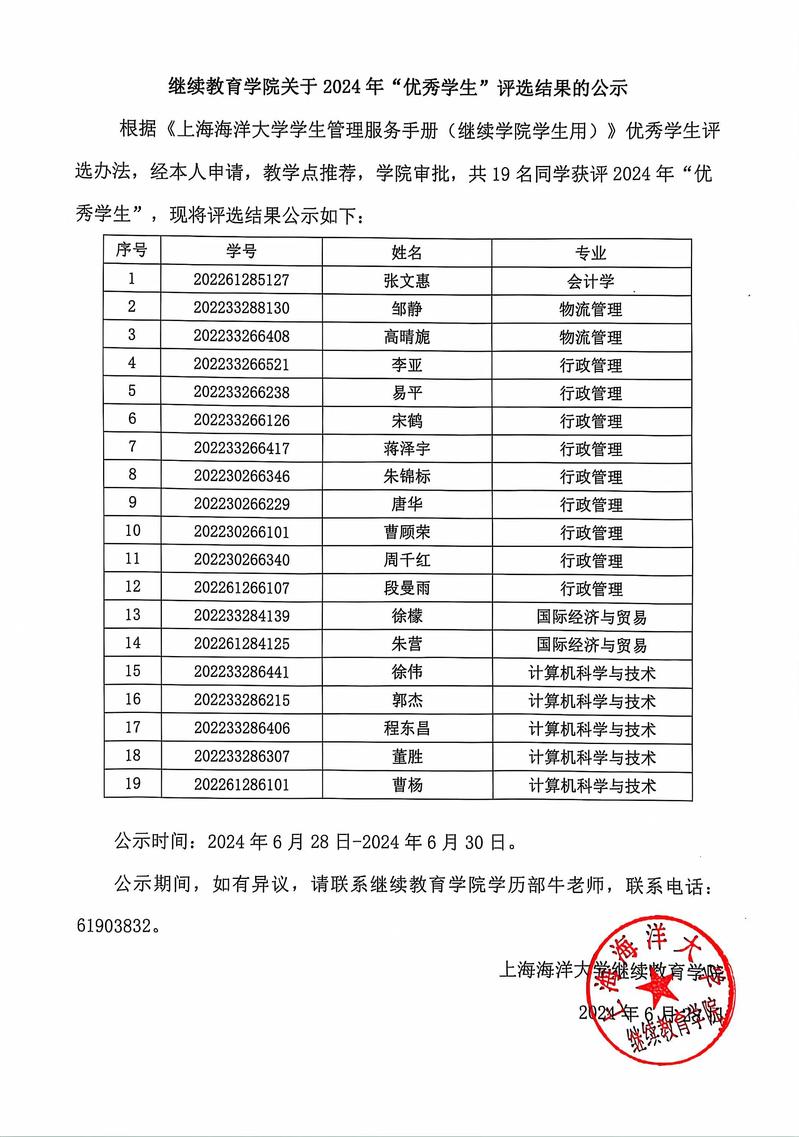 beat365唯一官方网站关于2024年“优秀学生”评选结果的公示